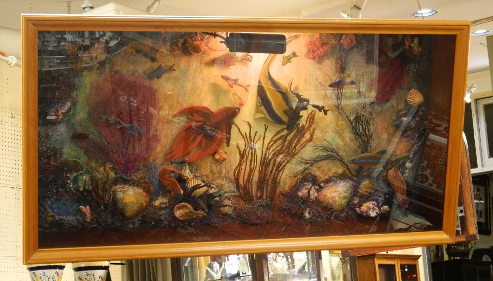 LOT 97 Illuminated Aquarium Shadow Box, Signed "Chaza/94" 26 1/2" x 54 1/4" x 8 1/2". Estimate: $150 - $300 Auction Date: Tuesday, January 31 2023 at 6:00 PM