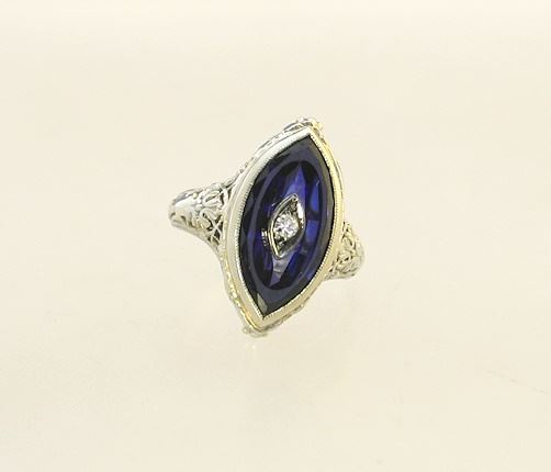 18K (stamped) White Gold with Diamond and Synthetic Sapphire Ring, 3.8 grams, Size 3 1/4.