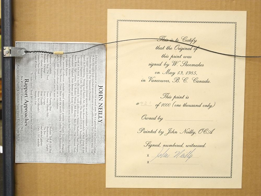 LOT 315 Limited Edition Print signed John Neilly, 10 5/8" x 14 3/4", "Willie Shoemaker". Estimate: $50 - $100 Sold For: $100 Auction Date: Tuesday, May 14 2024 at 4:00 PM