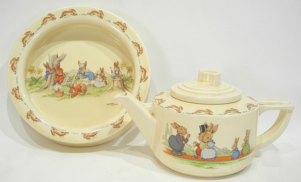 LOT 224 Collection of Royal Doulton Barbara Vernon Bunnykins, as found - Pottery Jug Noted. Estimate: $100 - $150 Sold For: $100 Auction Date: Tuesday, May 06 2025 at 4:00 PM