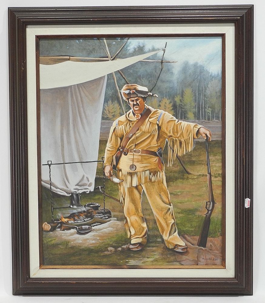 Acrylic on Moosehide signed P. (Phyllis) Ljuden'86, 20 x 16", "At The Black Powder Shoot".