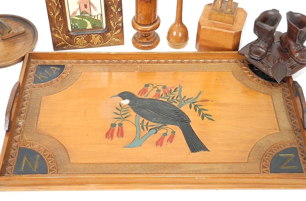 LOT 180 Collection of Naive Folk Art Wood Carvings: Tray (23"w)/Athlete/Treen/ Popeye. Estimate: $50 - $60 Sold For: $70 Auction Date: Tuesday, May 06 2025 at 4:00 PM