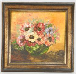 LOT 22 Oil on Board signed Lambert, 12 3/4 x 13 3/4", "Bowl of Pansies". Estimate: $50 - $60 Sold For: $90 Auction Date: Tuesday, May 06 2025 at 4:00 PM