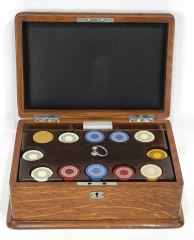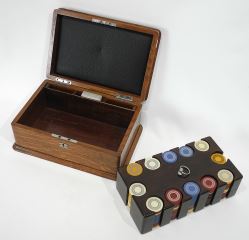 LOT 341 Early 20th C. Oak Cased Poker Chip Set, 5 1/2 x 12 3/4 x 8 5/8". Estimate: $60 - $100 Sold For: $100 Auction Date: Tuesday, May 06 2025 at 4:00 PM