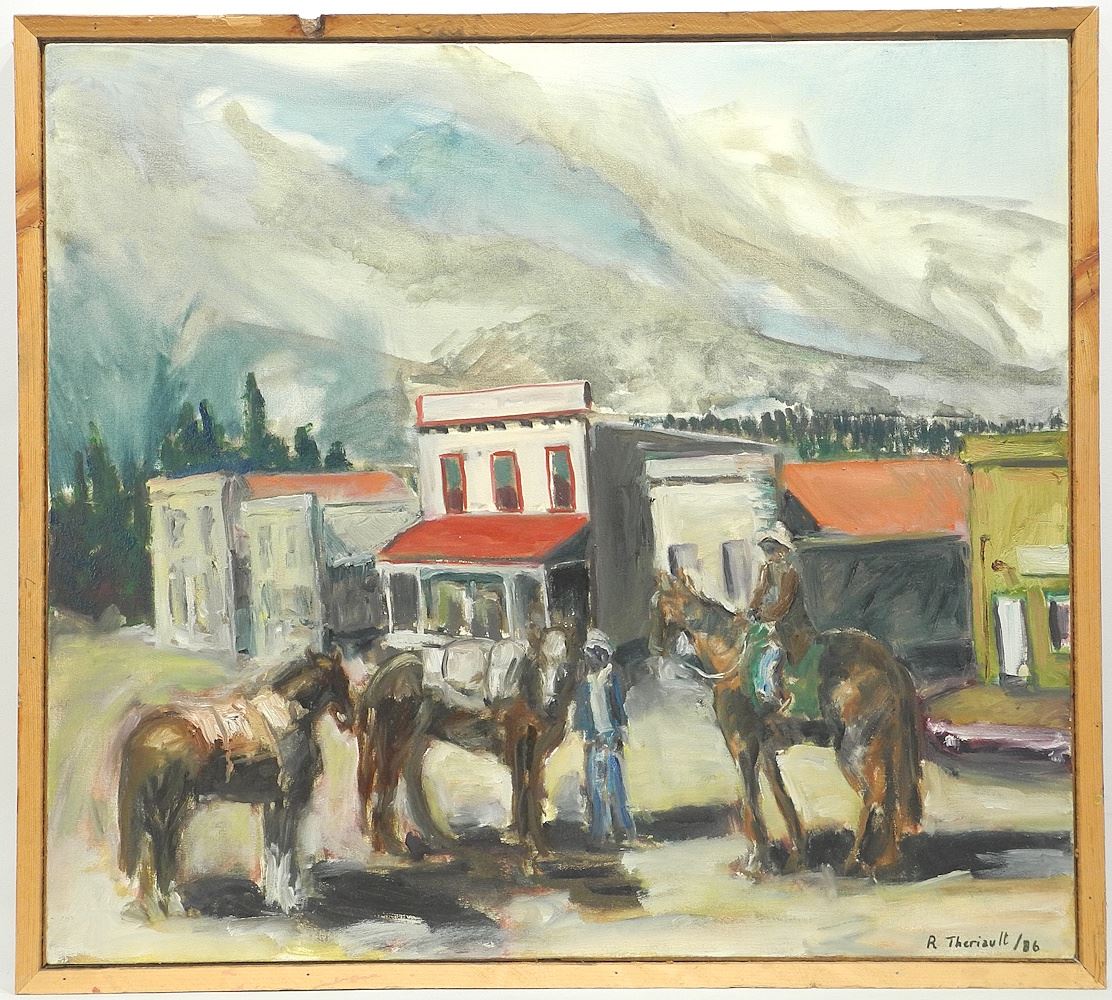 Oil on Canvas by Ray Theriault, 30 x 28", "Western Town", 1987.