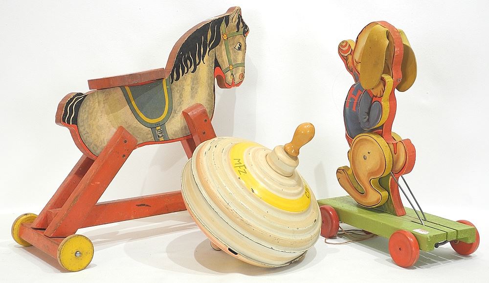 LOT 261 Two Vintage Fisher Price Pull Toys & MFZ Choral Top, 8 1/2 - 13 1/4"h. Estimate: $50 - $60 Sold For: $40 Auction Date: Tuesday, May 06 2025 at 4:00 PM