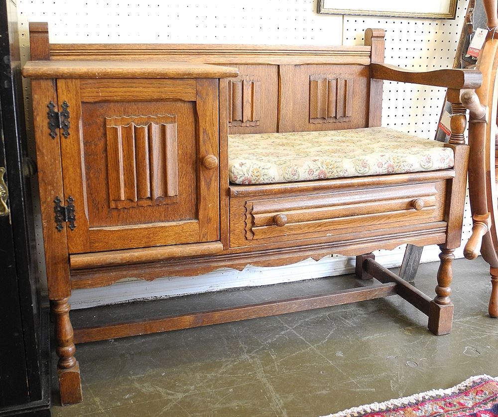 LOT 13 Oak Linen Fold Chatter Bench, 38"w. Estimate: $60 - $100 Sold For: $50 Auction Date: Tuesday, July 08 2025 at 4:00 PM