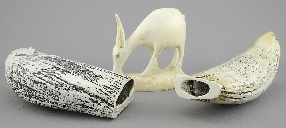 Two Replica Scrimshaw Teeth & Antelope Carving, 3 - 5 3/4"h, NO EXPORT.