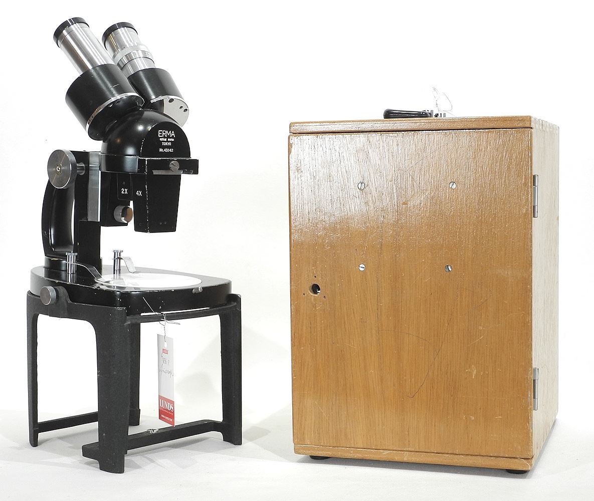 Erma Optical Works Tokyo No.43142 Microscope with Case & Stand, 11"h.