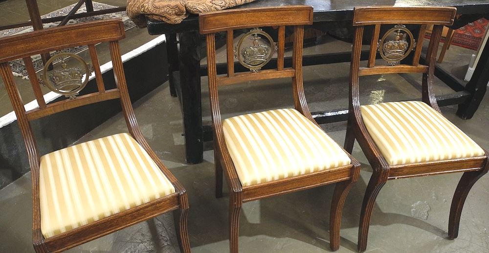 LOT 48 Three Regency-Style Chairs with Brass Crown Roundels, 31 3/4"h. Estimate: $100 - $200 Sold For: $20 Auction Date: Tuesday, September 09 2025 at 4:00 PM