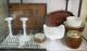Collection of Oak & Milk Glass Candlesticks/Bowls/Biscuit Barrel