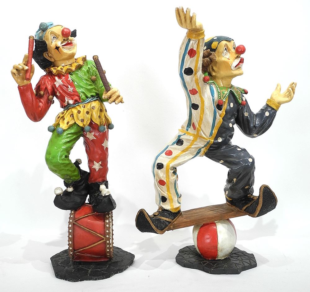 LOT 289 Two Cast Resin Clown Ornaments, 22 1/2"h. Estimate: $50 - $100 Sold For: $100 Auction Date: Tuesday, September 09 2025 at 4:00 PM
