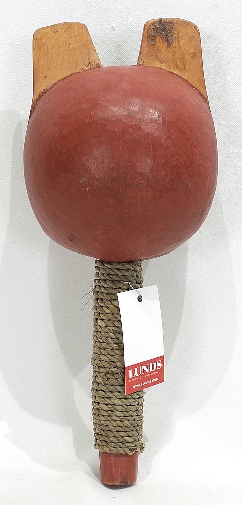 LOT 78 Reproduction Northwest Coast-Style Rattle, 13"h. Estimate: $50 - $100 Sold For: $130 Auction Date: Tuesday, September 09 2025 at 4:00 PM