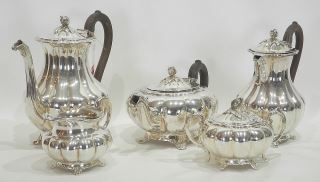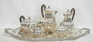 LOT 323 Rogers Six Piece Silver Plated Tea & Coffee Service, Tray 28 1/2"w. Estimate: $50 - $100 Sold For: $60 Auction Date: Tuesday, September 09 2025 at 4:00 PM