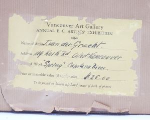LOT 188 Watercolour Monogrammed JVDG (J. Van der Gracht), 12 1/2 x 14 3/4", "Spring, Capilano River". Estimate: $60 - $100 Auction Date: Tuesday, March 17 2026 at 4:00 PM