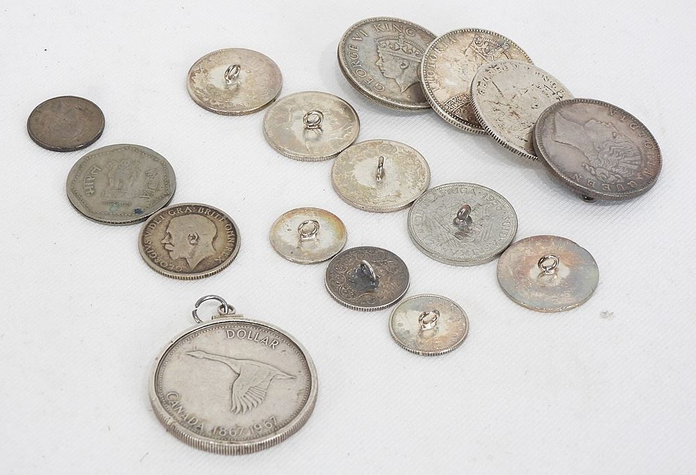 LOT 167 Collection of One Rupee/Canadian/ English Coins Mounted as Buttons & Pin, 125g. Estimate: $100 - $200 Sold For: $150 Auction Date: Tuesday, March 17 2026 at 4:00 PM