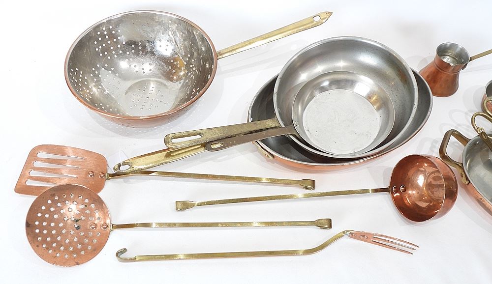 Collection of Copper Wares: Colander /Utensils/Pans, 2 1/2 - 8 3/8" Diam