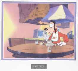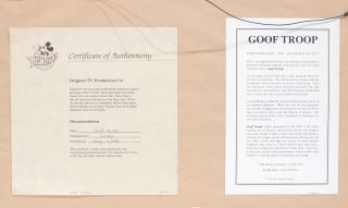 LOT 319 Walt Disney TV Production Cel "Goof Troop" 1993 w/COA, 8 7/8 x 11 1/4". Estimate: $60 - $100 Sold For: $70 Auction Date: Tuesday, March 17 2026 at 4:00 PM
