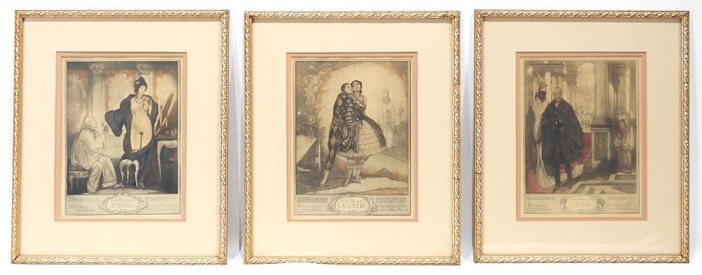 Coloured Etchings by Andre Lambert, 8 1/8 x 6 1/8", "Six of Seven Deadly Sins".