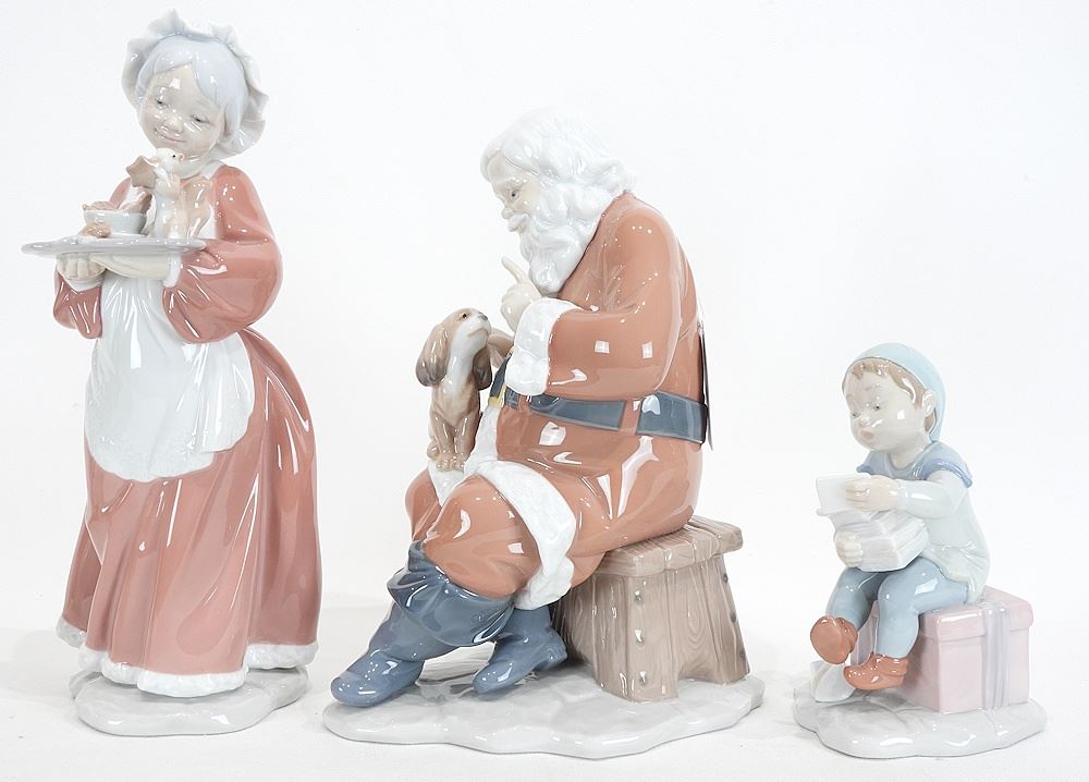 Six Lladro Figurines: 3 Santas Magical Workshop/3 Dogs.