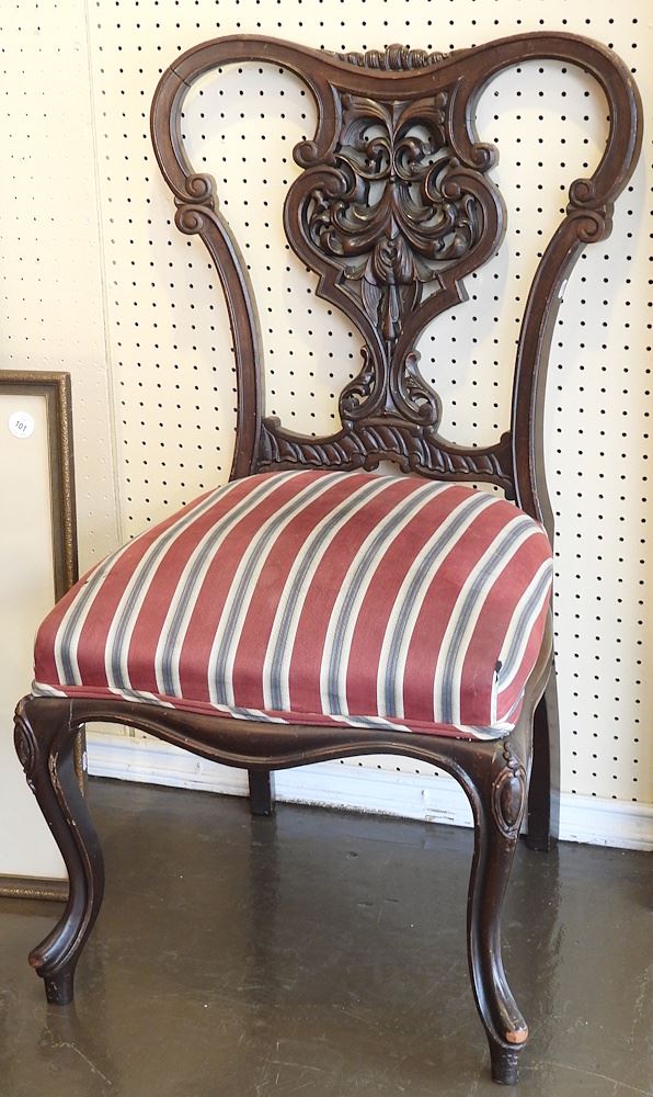 LOT 44 Carved Mahogany Armchair & Side Chair, 39 1/2 & 38"h. Estimate: $60 - $100 Sold For: $80 Auction Date: Tuesday, March 17 2026 at 4:00 PM