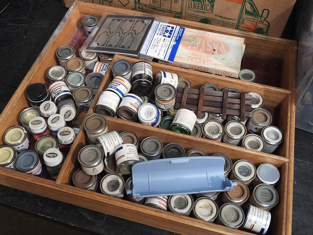 Large Collection of Model Paints/ Magazines & Sundries with Compressor (needs re-wiring).