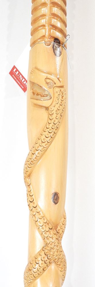 LOT 121 Hand Carved Serpent Wrapped Tiki- Style Walking Stick, 52 1/2"h. Estimate: $50 - $60 Sold For: $45 Auction Date: Tuesday, March 17 2026 at 4:00 PM