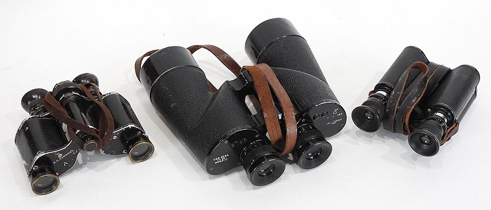 LOT 141 Three Pair Binoculars: H.R. Hammond/ Ross London No.20706/CGB 7 x 50, 2 with Cases & Lanyard. Estimate: $60 - $100 Sold For: $40 Auction Date: Tuesday, March 17 2026 at 4:00 PM