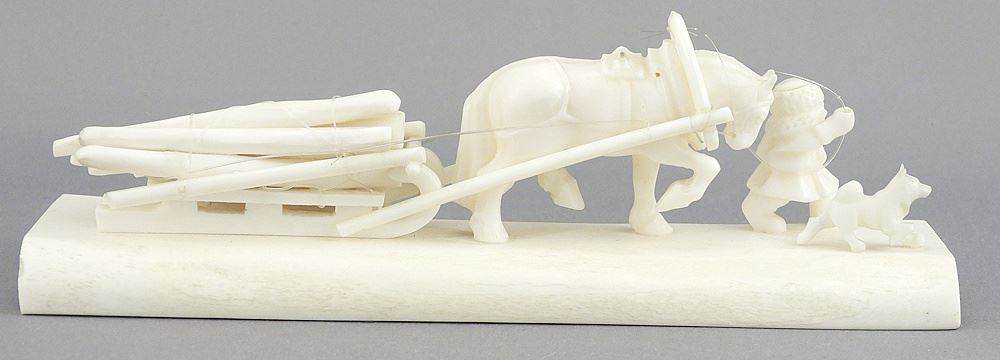 Hand Carved Bone Horse & Sled with Driver, 2 1/8 x 7 x 2 3/8".