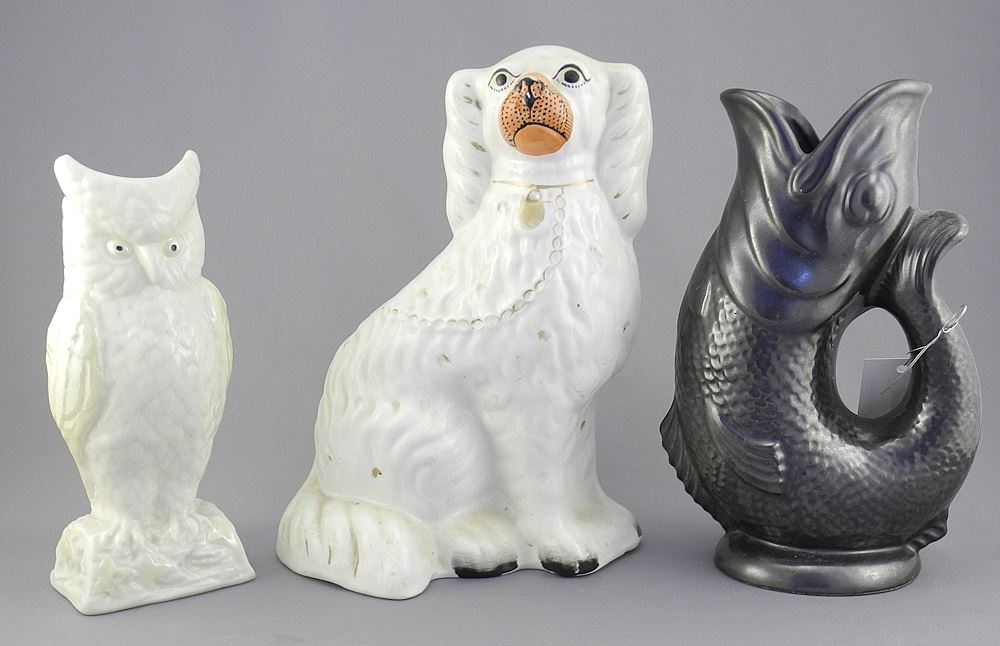 LOT 38 Staffordshire Dog, Devon Fish Jug & Belleek Owl. Estimate: $50 - $70 Sold For: $50 Auction Date: Tuesday, March 17 2026 at 4:00 PM