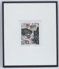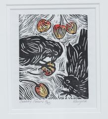 Lino Relief Print signed Kungold (Amman), 4 3/4 x 4" "Crabby Crows" #3/25.
