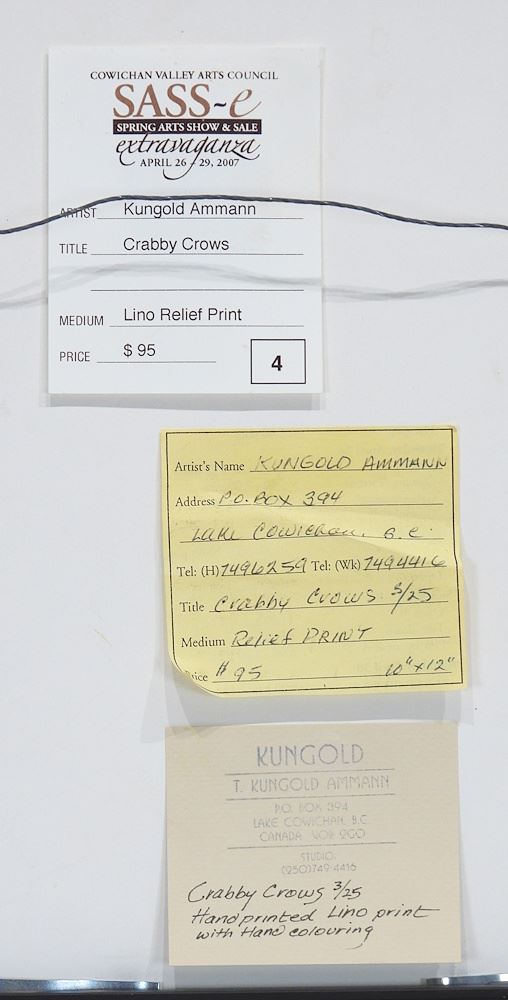 LOT 206 Lino Relief Print signed Kungold (Amman), 4 3/4 x 4" "Crabby Crows" #3/25. Estimate: $50 - $60 Sold For: $90 Auction Date: Tuesday, March 17 2026 at 4:00 PM