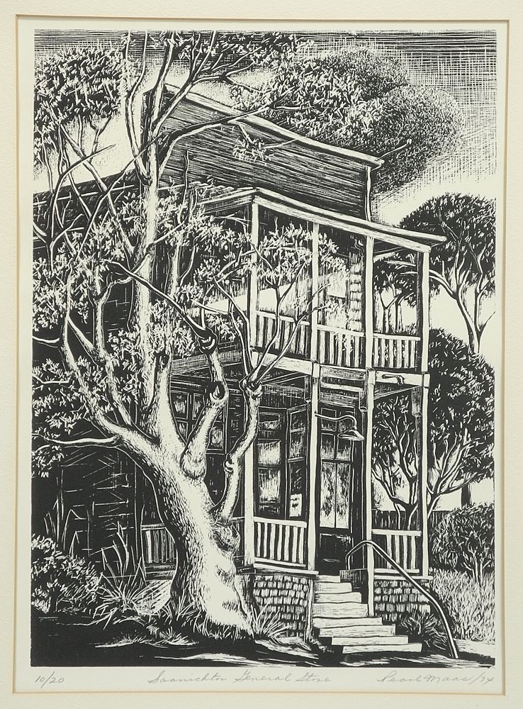 Serigraph signed Peal Maas, 16 3/4 x 11 3/4", "Saanichton General Store " #10/20.