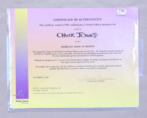 LOT 318 Two Warner Bros Animation Cels, 9 1/8 x 11 1/8", "Marriage Made..."& "Just Married" w/COA. Estimate: $100 - $300 Sold For: $200 Auction Date: Tuesday, March 17 2026 at 4:00 PM