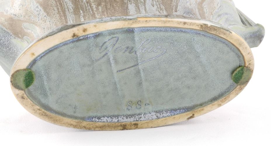 Art Nouveau art pottery two handled oval shaped dish signed on bottom, 9 1/2".