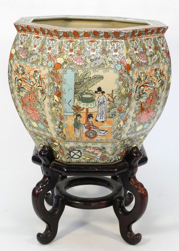 Chinese Famille Rose octagonal jardiniere, 12 1/5" high & stand.