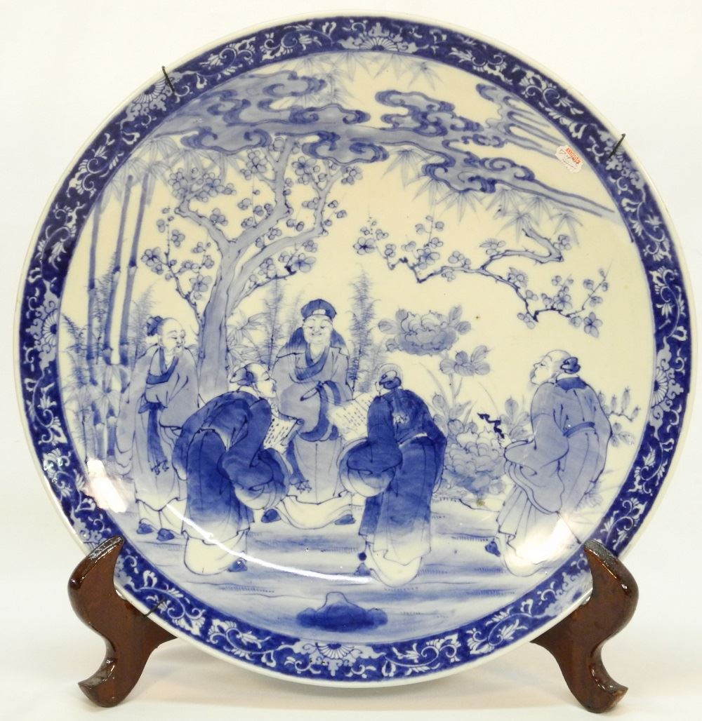 Pair of Chinese Blue & White Porcelain "Scholars" Chargers, 18 1/4" diameter.