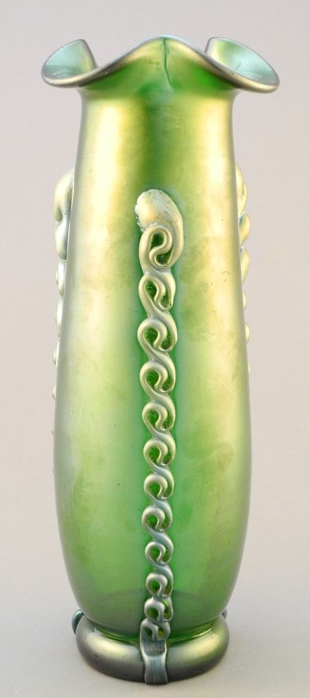 LOT 234 Antique Loetz Style Iridescent Vase with Decorative Vertical Applique, 10" high. Estimate: $75 - $125 Sold For: $240 Auction Date: Tuesday, May 18 2021 at 6:00 PM