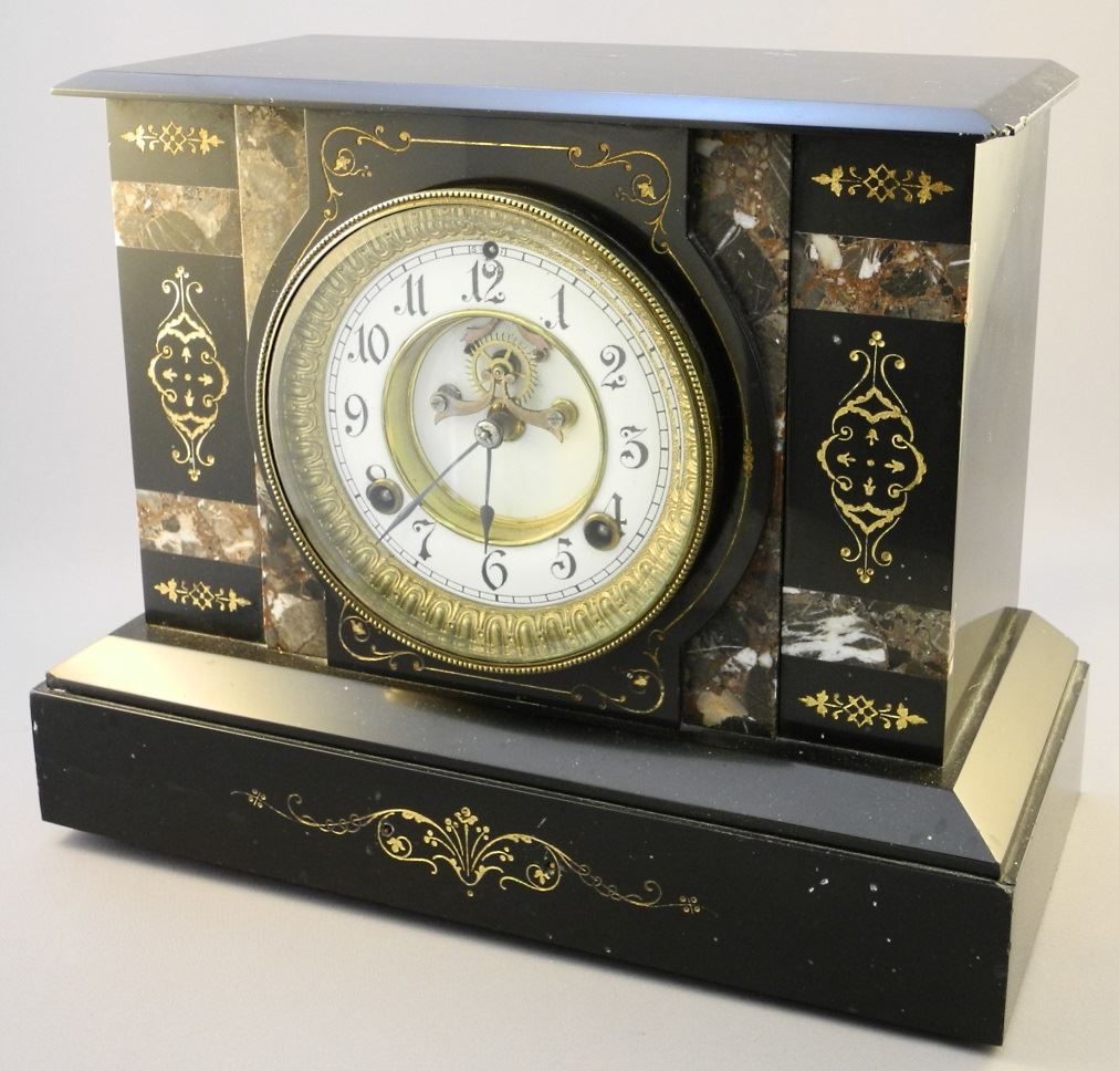 LOT 157 Waterbury Clock Co. Eastlake Slate Mantle Clock, 13 1/8" wide, chips. Estimate: $80 - $100 Sold For: $100 Auction Date: Tuesday, May 18 2021 at 6:00 PM