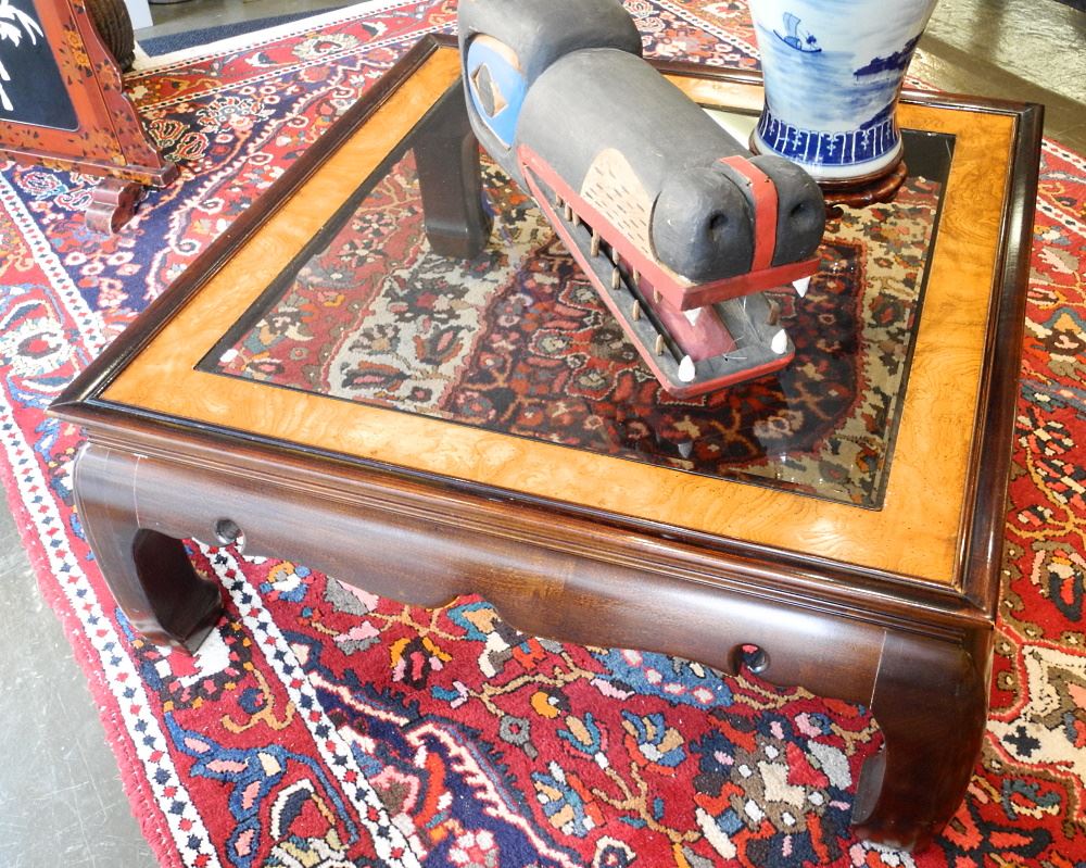 Oriental Influence Glass Inset Low Table, 39" Wide.