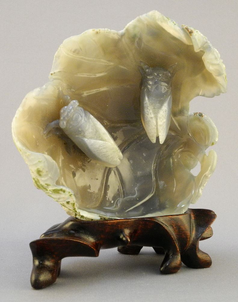 LOT 132 Chinese Jade Cicadas on Leaf Carving (4 3/4") with Stand & Box. Estimate: $150 - $200 Sold For: $250 Auction Date: Tuesday, November 01 2022 at 6:00 PM