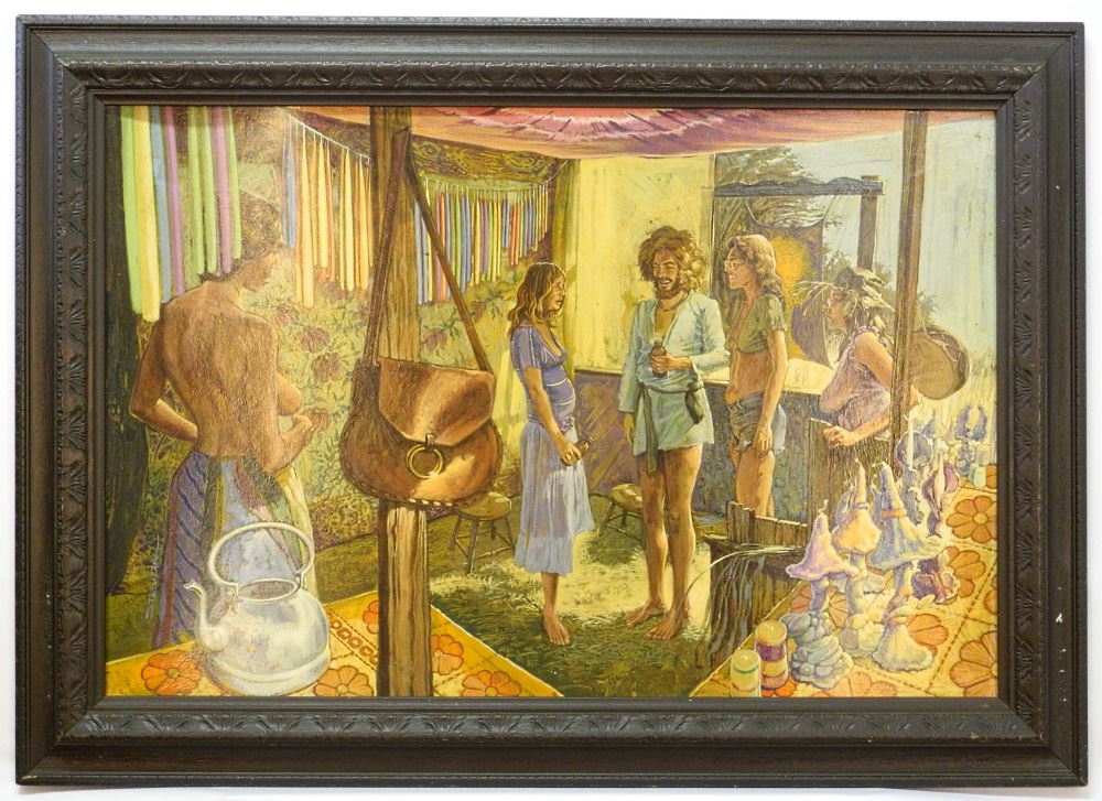 LOT 42 Oil on Board Signed L.B. Stewart, 19 1/2" x 29 1/4", "Hippie Candle Makers". Estimate: $100 - $150 Sold For: $80 Auction Date: Tuesday, November 01 2022 at 6:00 PM