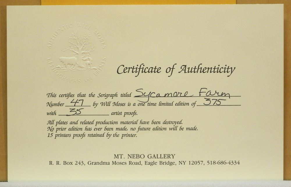 LOT 53 Limited Edition Print Signed Will Moses, 8 5/8" x 20 1/2", "Sycamore Farm", #47/375. Estimate: $100 - $200 Sold For: $60 Auction Date: Tuesday, November 01 2022 at 6:00 PM