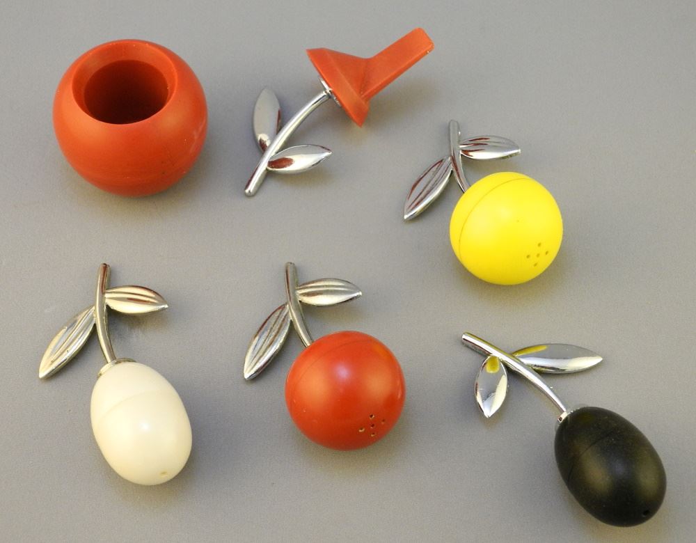 5 Fruit Shaped Condiment Dispensers, 3 3/4" High.