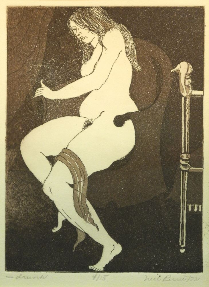 Aquatint Signed Nell Perret '72 6 1/2" x5", "Drunk".