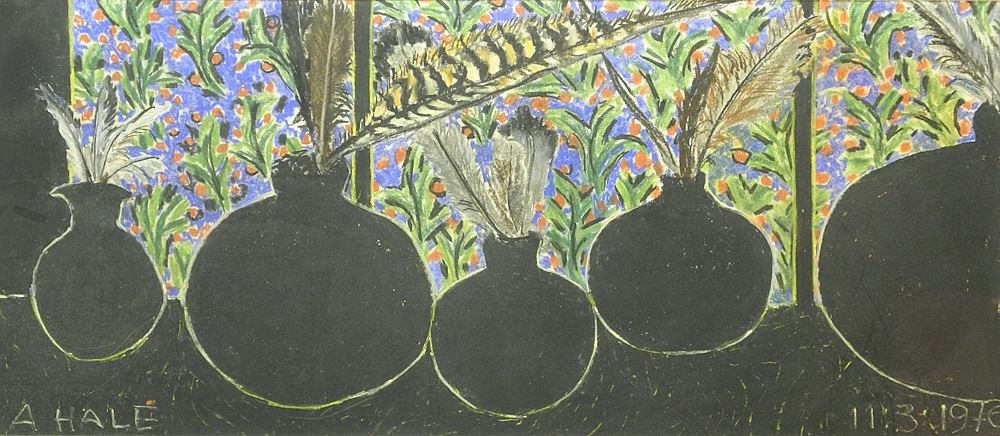 LOT 20 Mixed Media signed A (Anne) Hall, 10 x 23", "Feather Bottles". Estimate: $50 - $100 Sold For: $25 Auction Date: Tuesday, November 21 2023 at 4:00 PM
