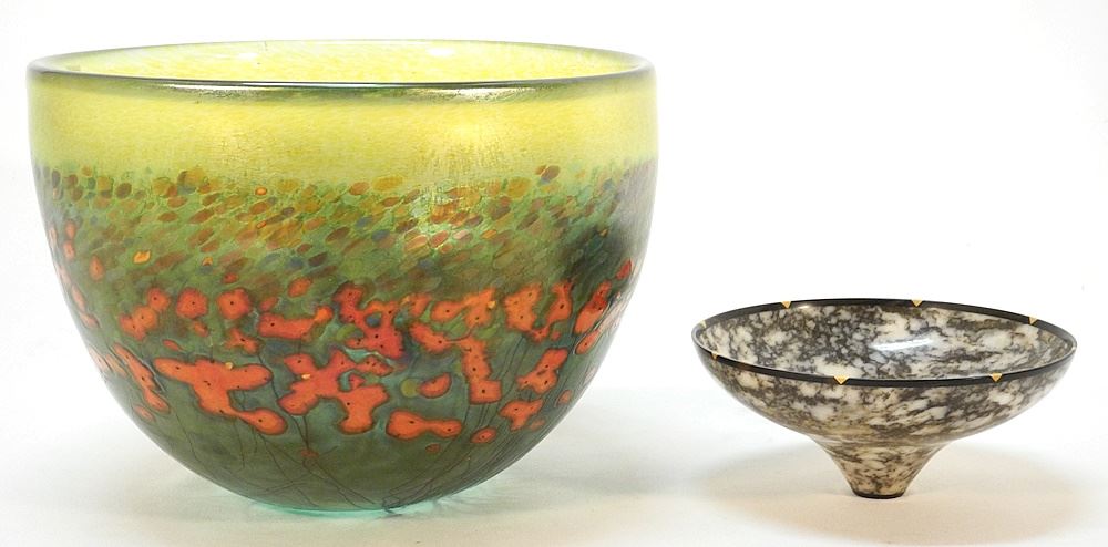 Robert Held Art Glass "Red Poppies" Bowl, 8"H, with Glass Dish & Bird.
