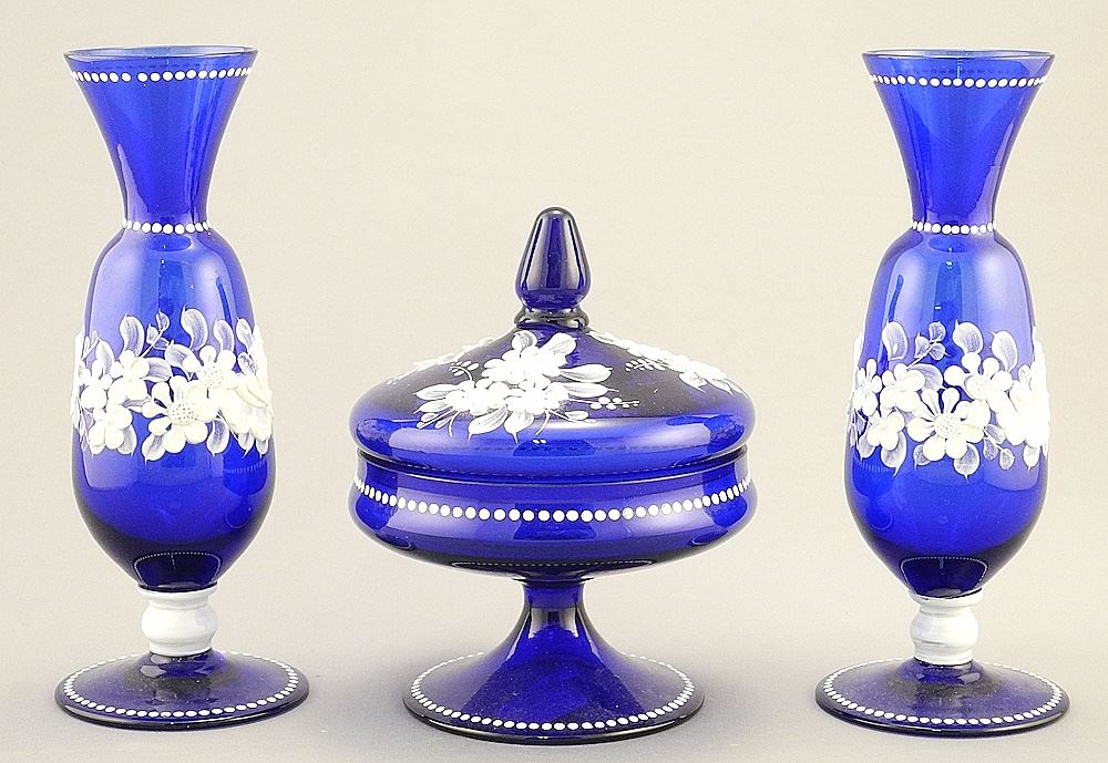 LOT 94 3 Piece Murano Cobalt Glass Floral Encrusted Garniture, 6 1/4"H. Estimate: $50 - $70 Sold For: $20 Auction Date: Tuesday, November 21 2023 at 4:00 PM