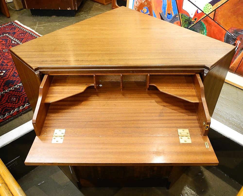 LOT 113 G-Plan Corner Bureau with Cabinet & Open Angled Shelf, 33 1/2' High Estimate: $150 - $300 Sold For: $140 Auction Date: Tuesday, November 21 2023 at 4:00 PM