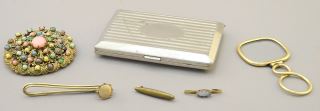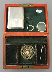 Cast Brass Looking Glass with Julius Harris Leather Box of Antique Sundries.
